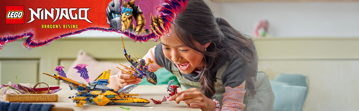 Das LEGO NINJAGO Ras und Arins Super-Sturmflieger (71833) Spielset lässt Jungen und Mädchen ab 8 Jahren Actionszenen aus der 3. Staffel der TV-Serie NINJAGO Aufstieg der Drachen nachstellen. Ein cooler Spielzeug Flieger mit abkoppelbarer Drohne und Rettungskapsel sowie 3 Minifiguren (Arin, Ras und ein Drachenkämpfer) und ein Mini-Modell einer Drachenkreatur laden zu unzähligen Rollenspielen ein. Dieses unglaubliche LEGO Bauset hat alles, was Kinder für ein tolles Spielerlebnis brauchen. Dieses fantasievolles Action Spielzeug verfügt über eine abkoppelbare drachenköpfige Drohne mit abnehmbaren Klingen und Triebwerken, 2 Shooter mit Federmechanismus, verstellbare Flügel, wirbelnde Sturmklingen und 2 Cockpits. Eines dieser Cockpits lässt sich abtrennen und dient dann als Rettungskapsel mit Flügeln. Die separat erhältlichen LEGO NINJAGO Bausets und Bauspielzeuge für Kinder umfassen Drachen, Fahrzeuge und Tempel, die Fans zu vielen Rollenspielen und Abenteuern mit ihren Helden einladen. Jedes dieser Ninja Spielsets kann auch mithilfe der LEGO Builder App gebaut werden. Die App nimmt dich und dein Kind auf ein einfaches und intuitives Bauabenteuer mit.